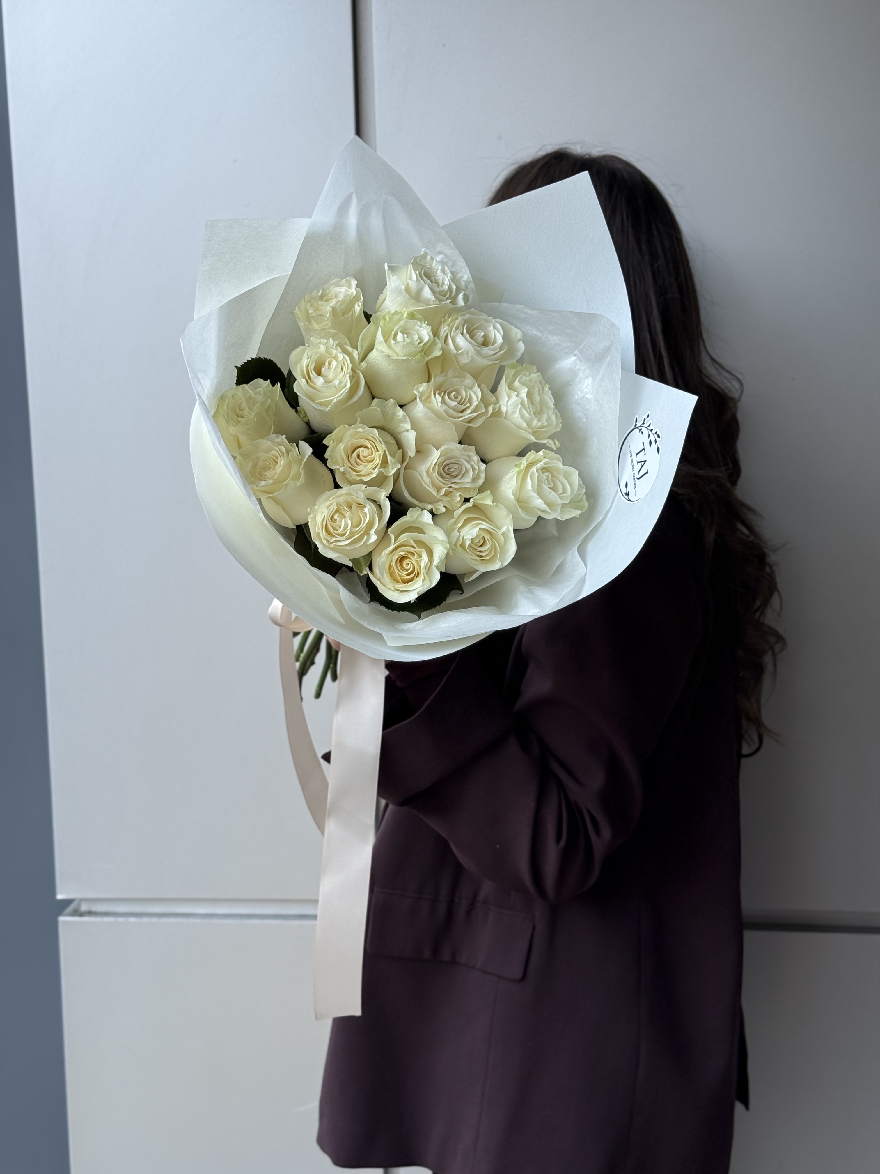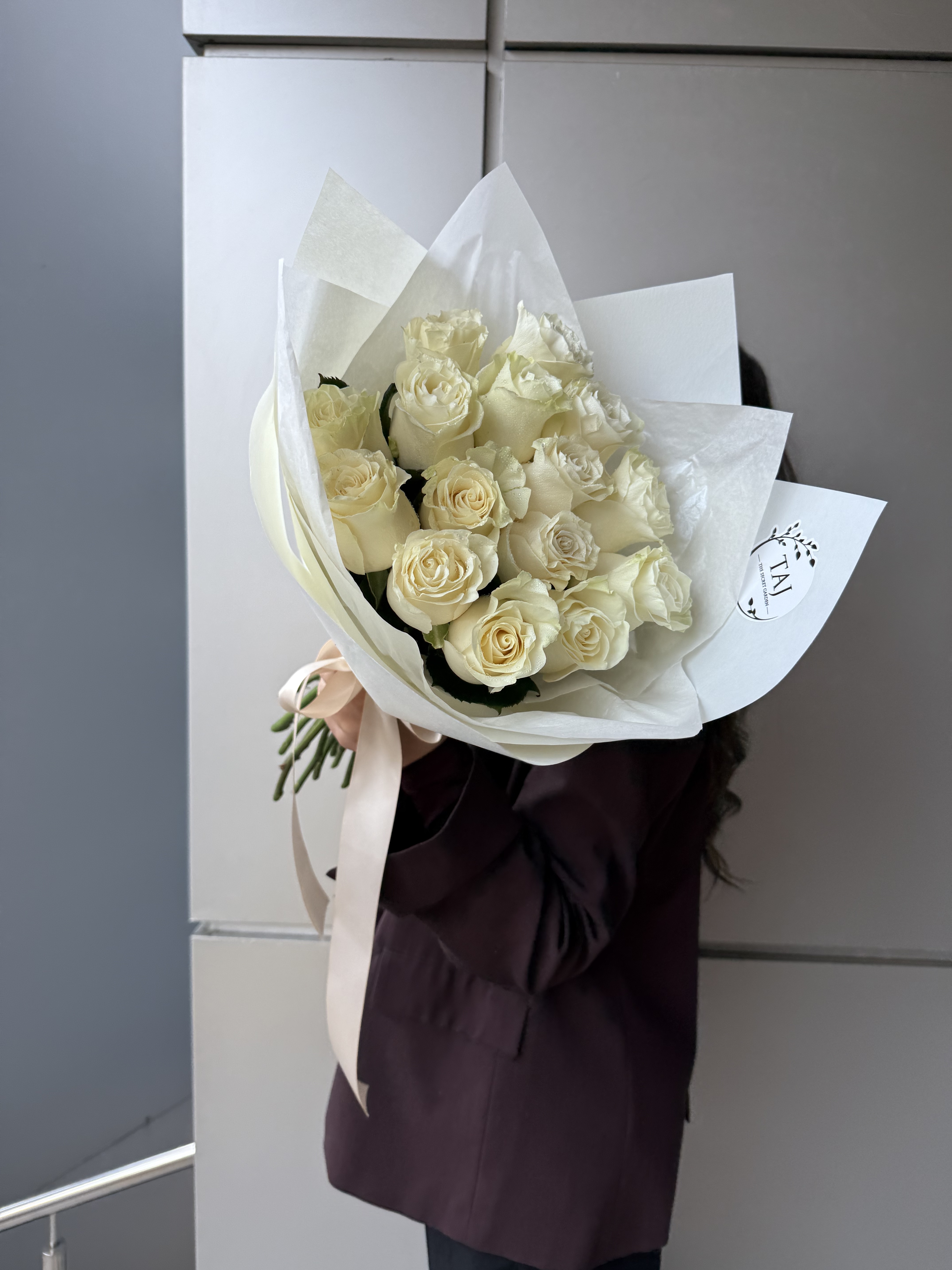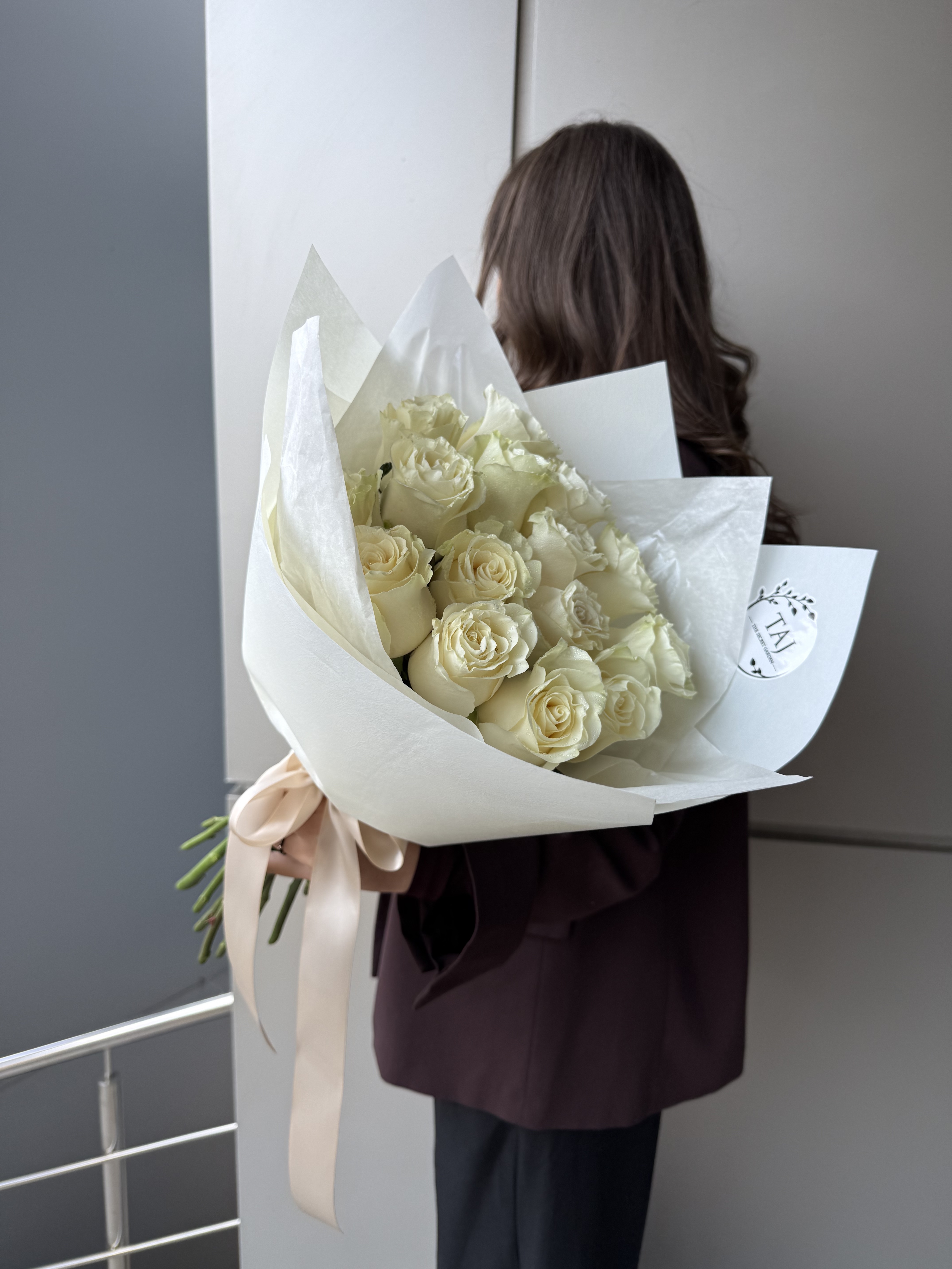 Buchet floral realizat din 15 trandafiri albi (Ecuador), ambalaj premium si panglica decorativa.