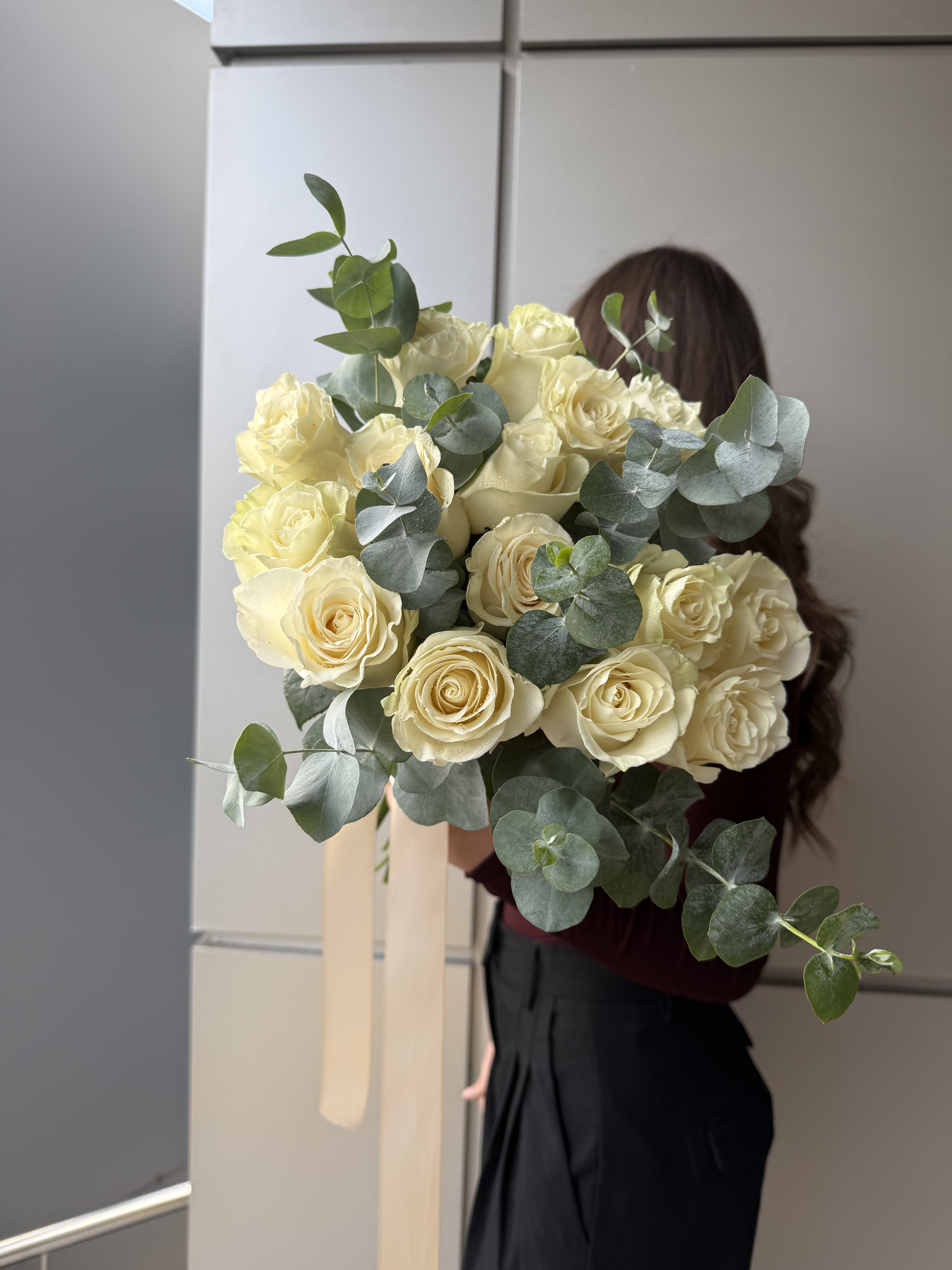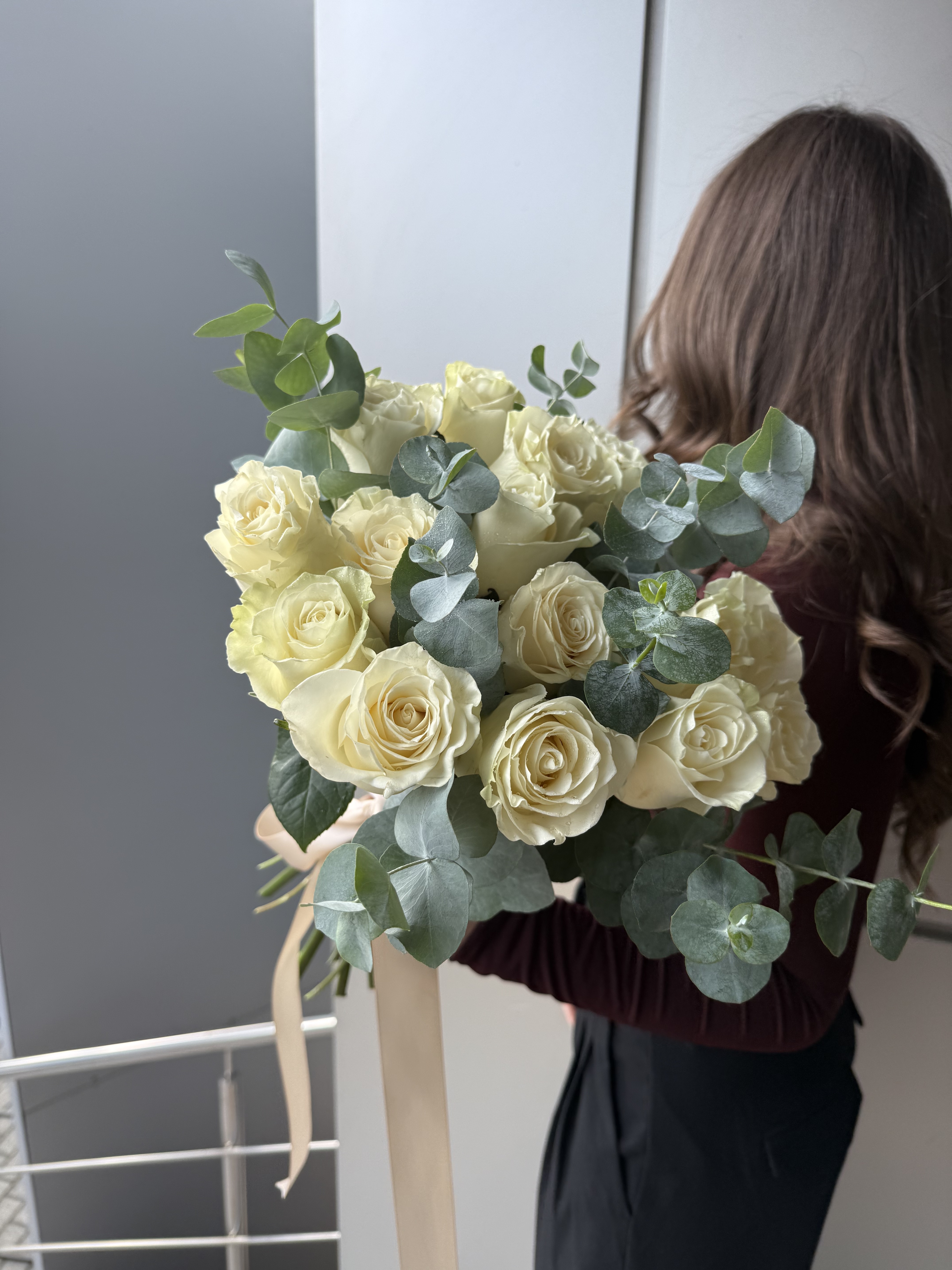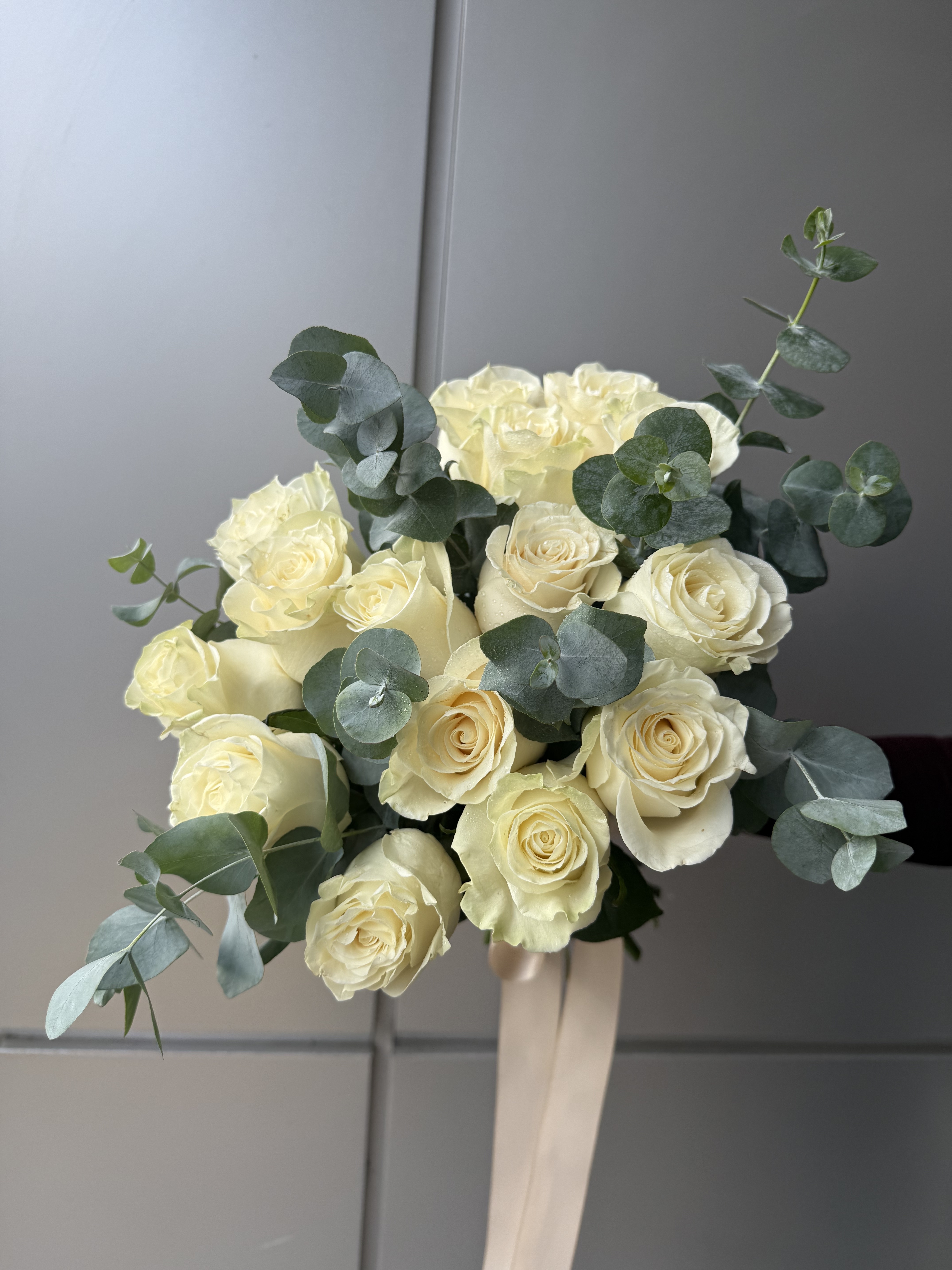 Buchet floral realizat din 15 trandafiri albi (Ecuador), eucalypt si panglica decorativa.