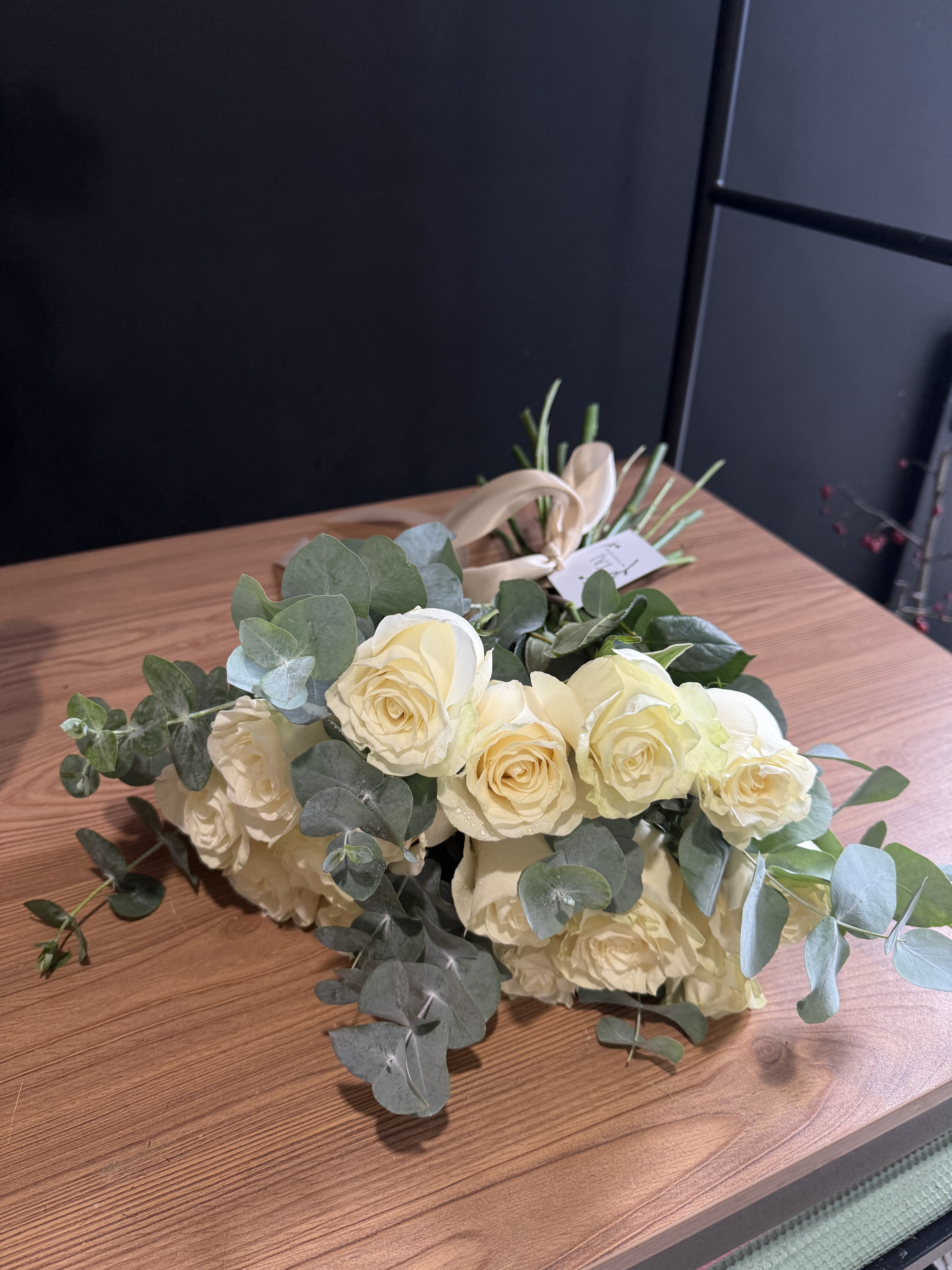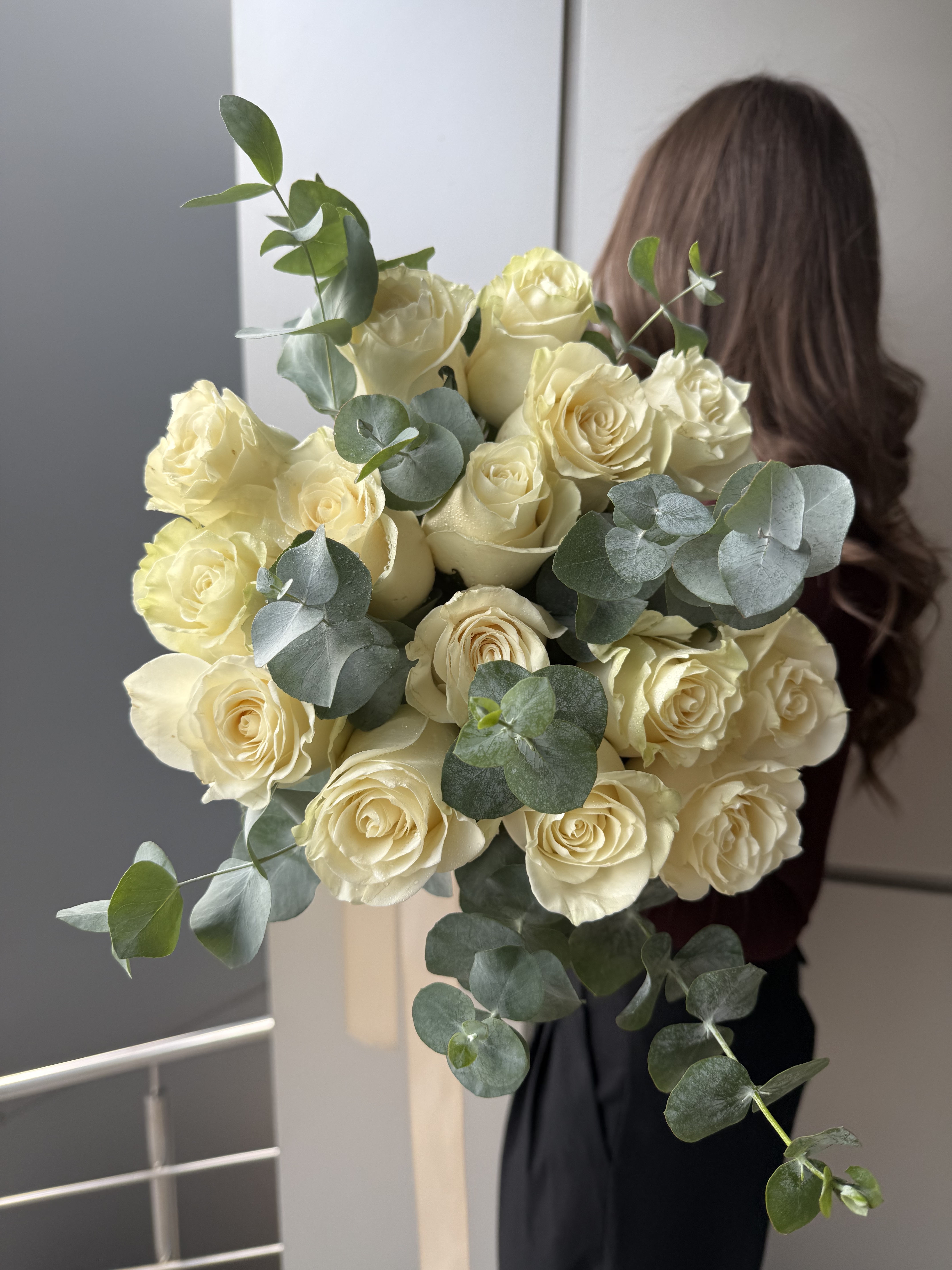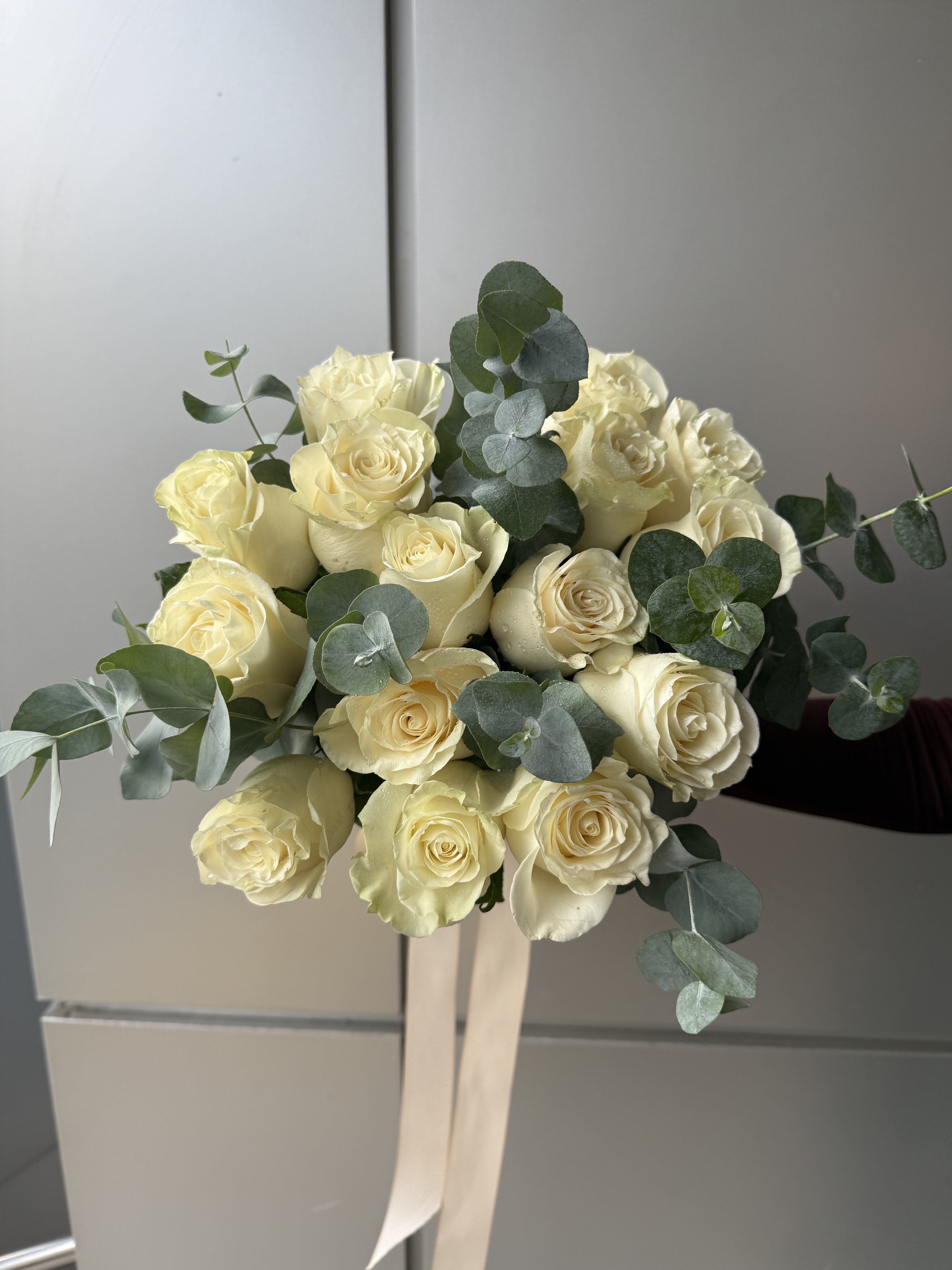 Buchet floral realizat din 15 trandafiri albi (Ecuador), eucalypt si panglica decorativa.