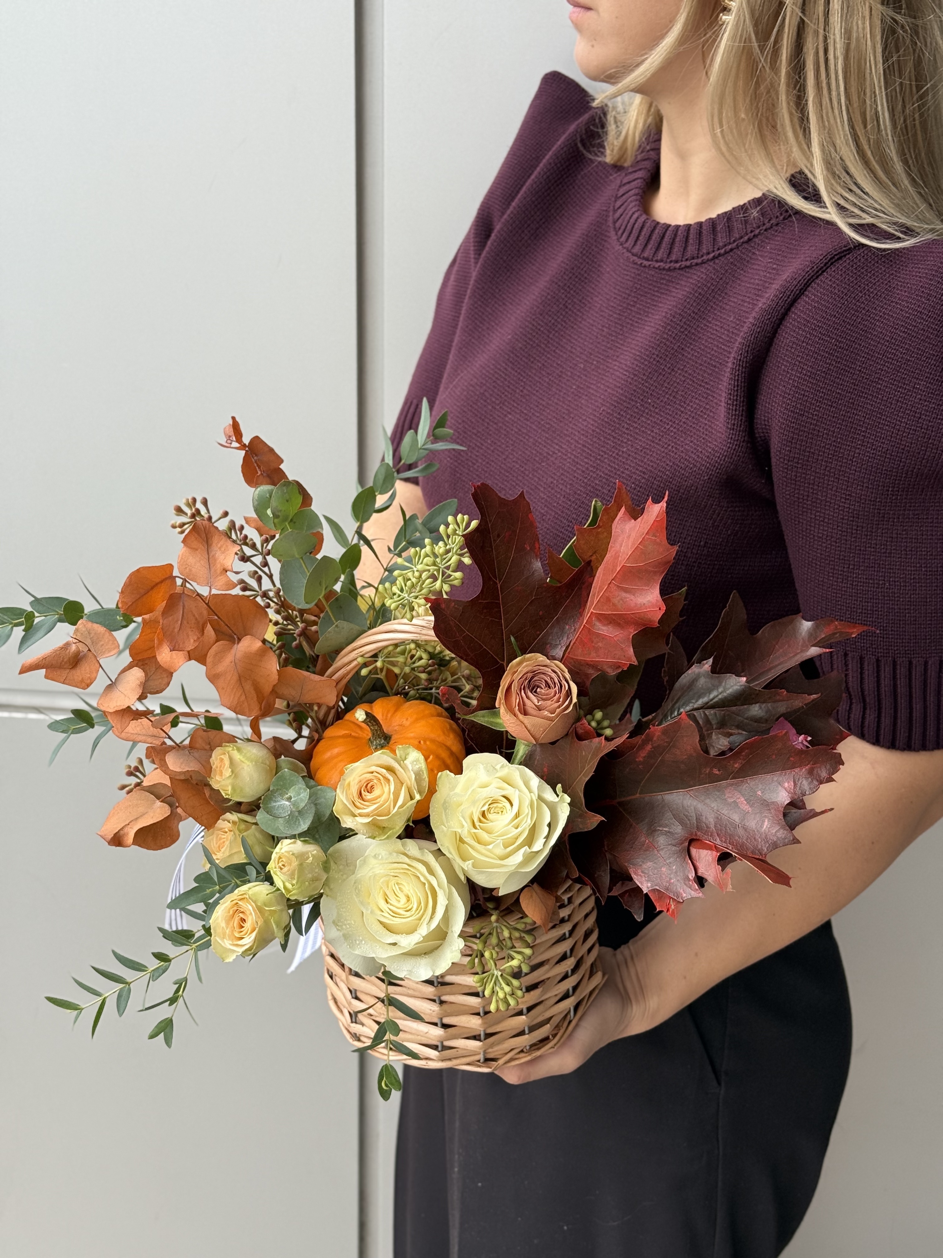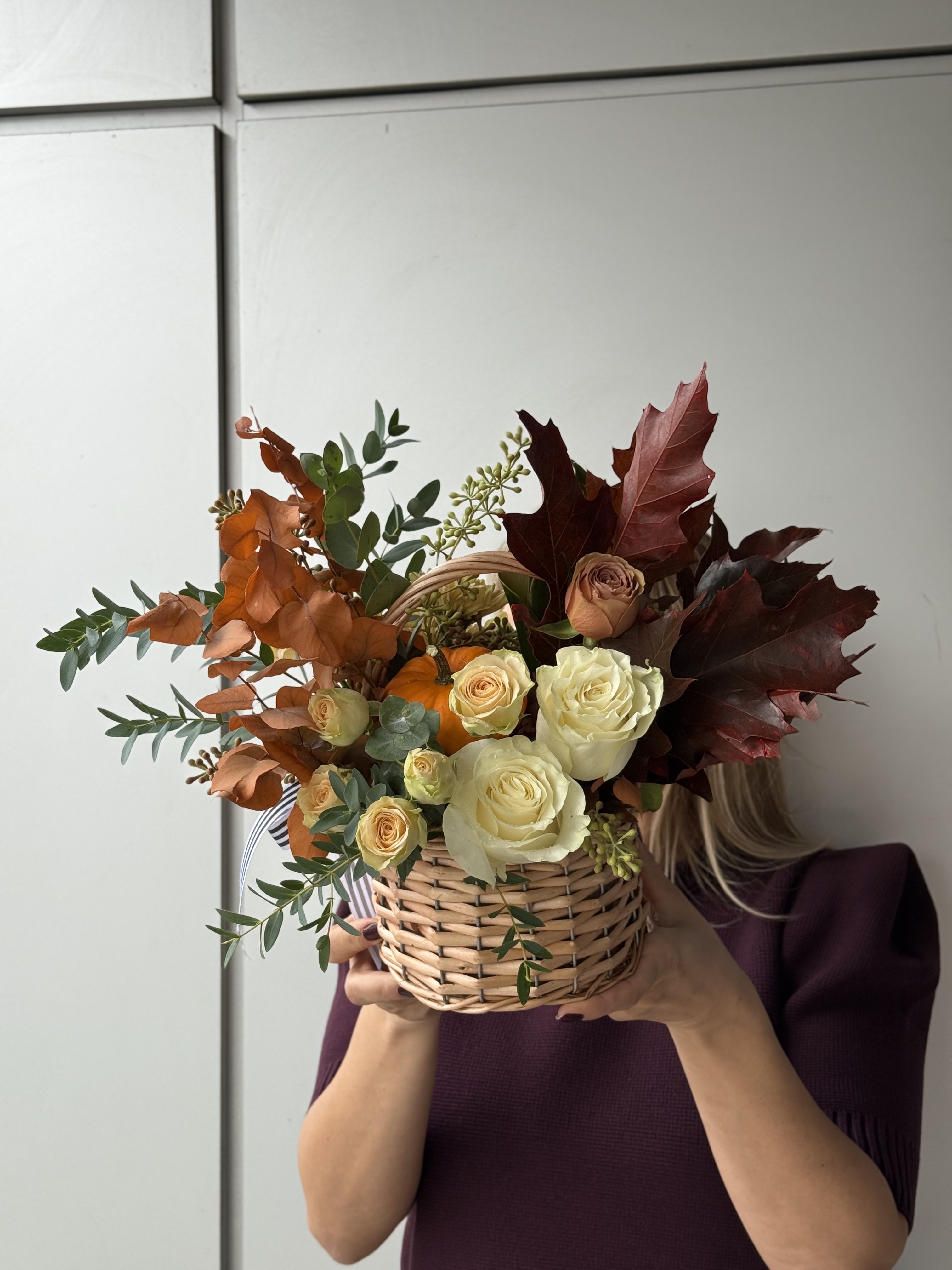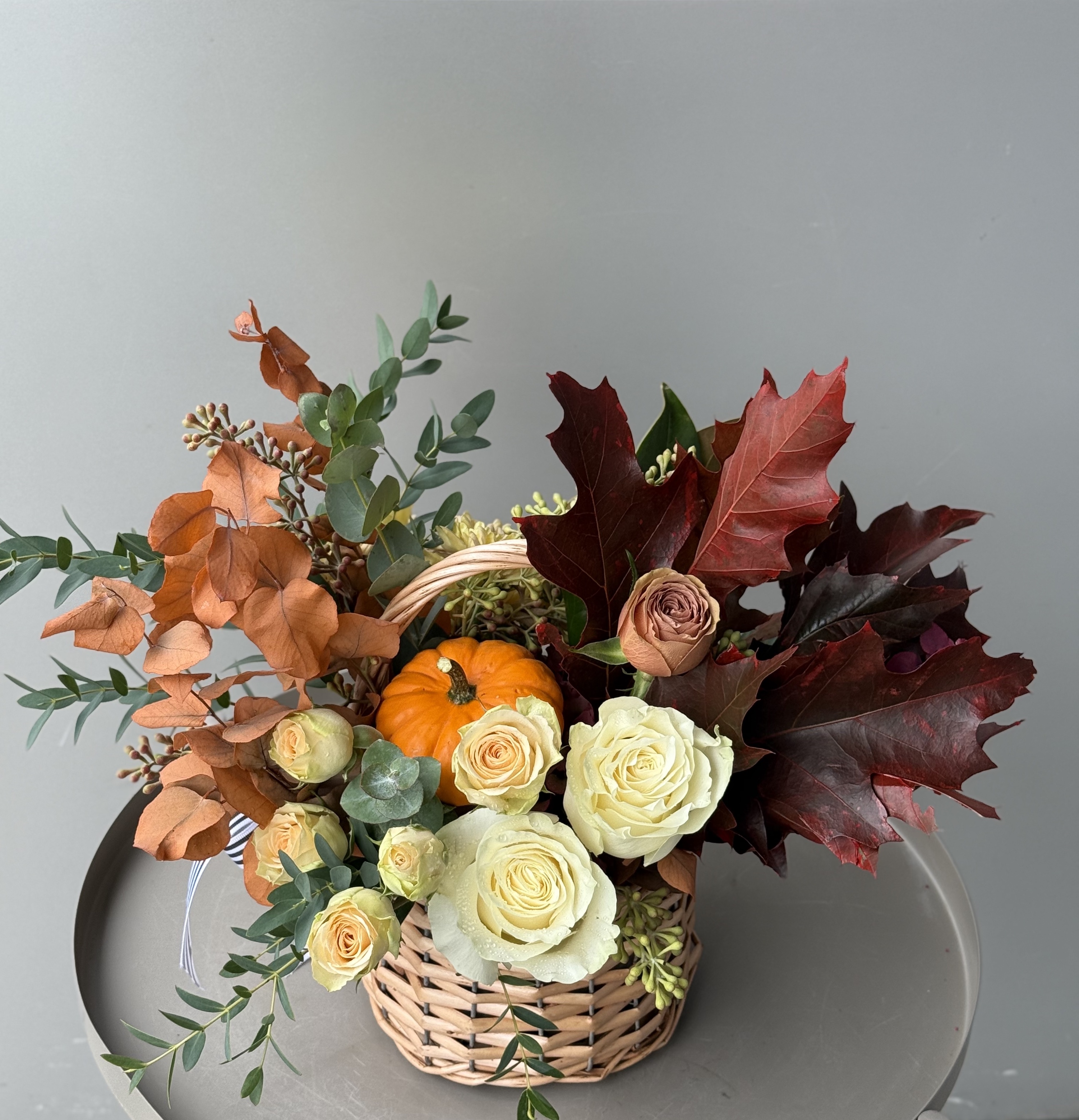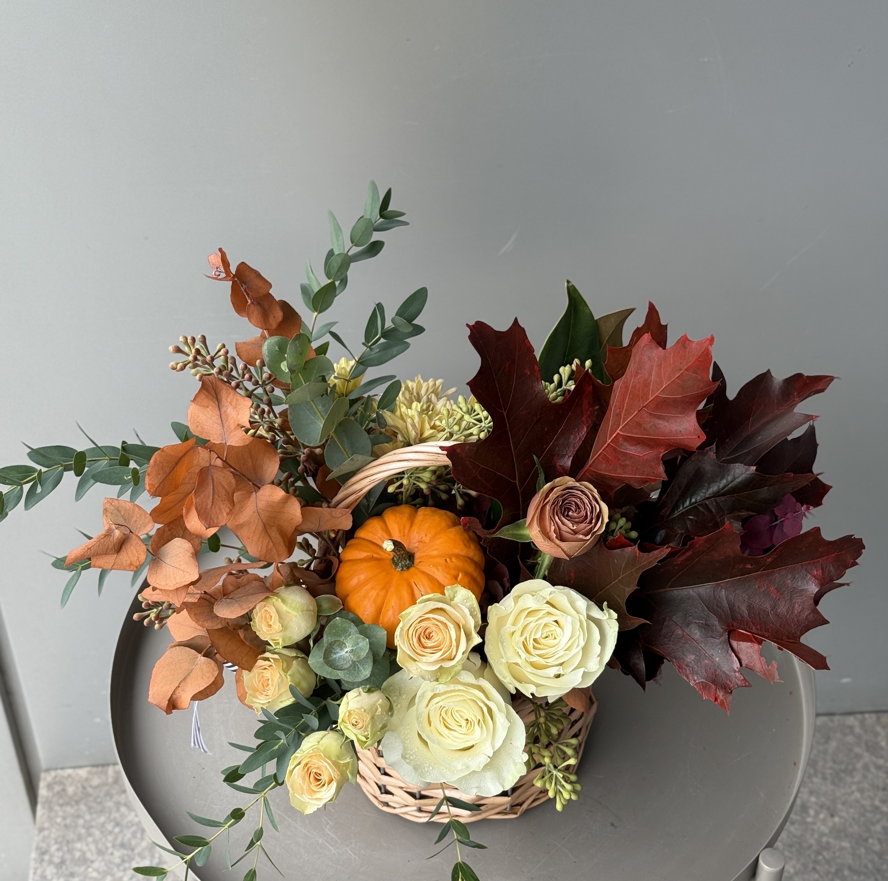 Compozitie: trandafiri, minirosa, mini dovlecel, crizanteme, eucalypt, frunze de stejar, frunze de magnolie.