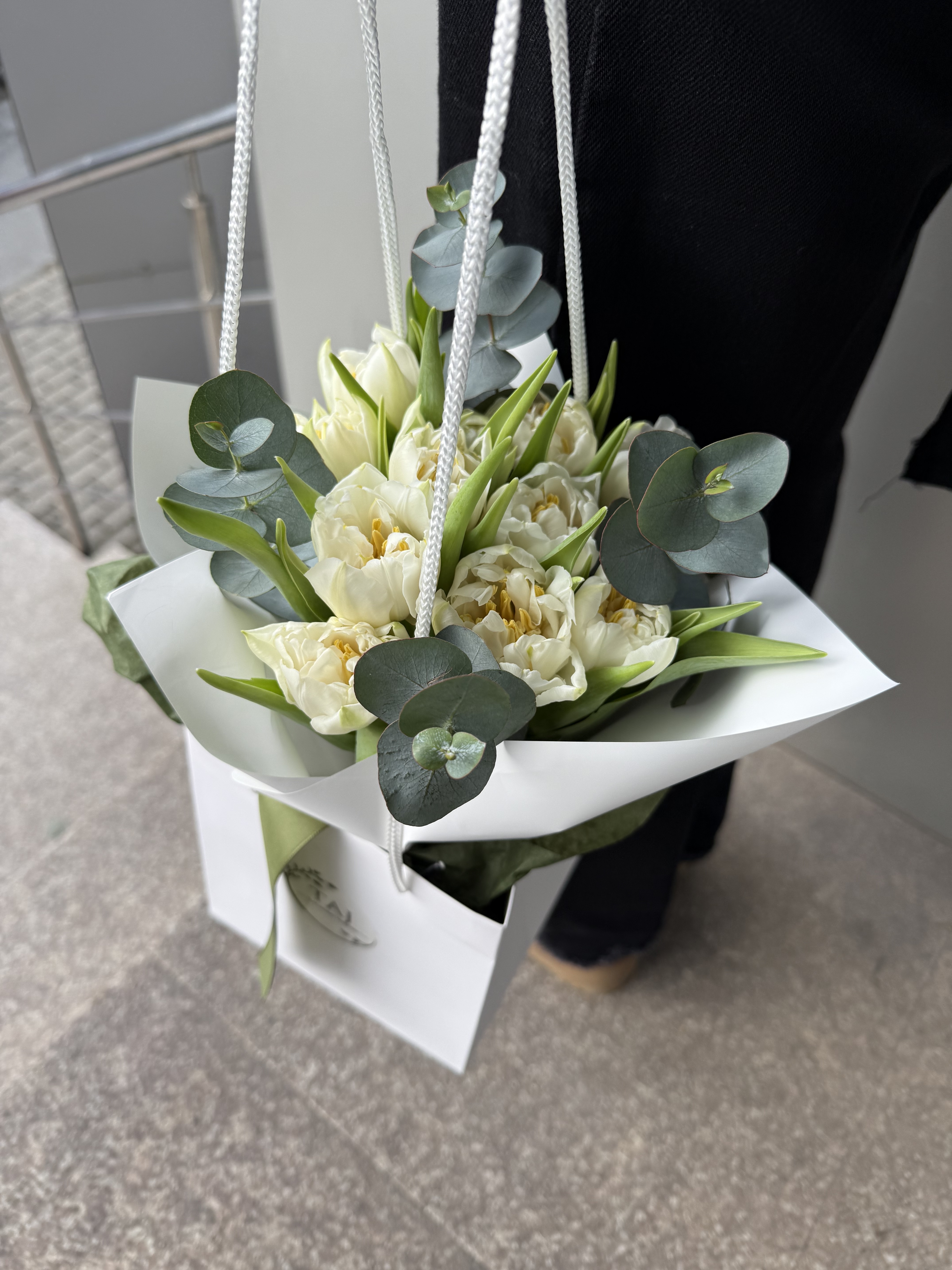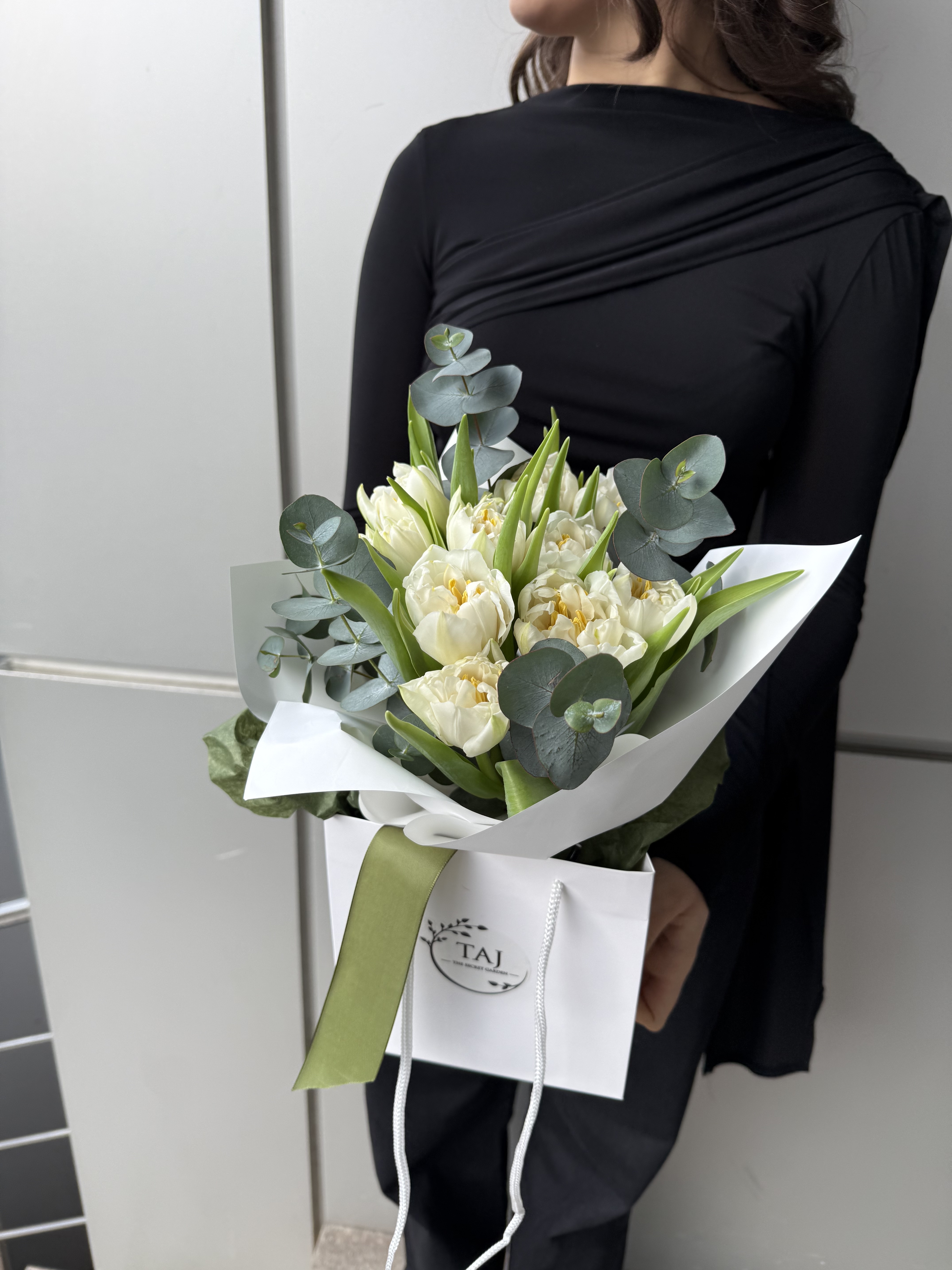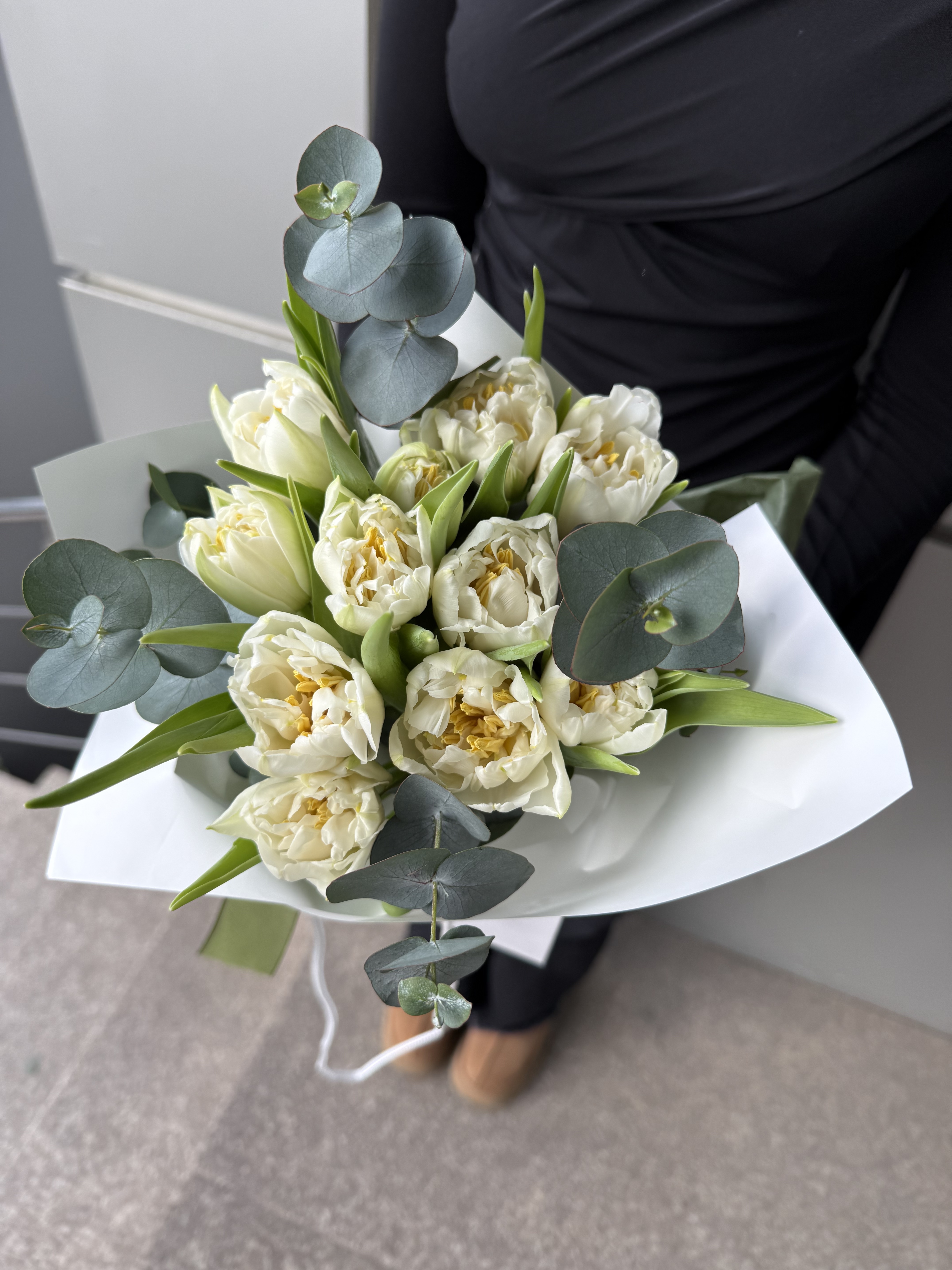 Buchet floral tip cadou (hidratare aquapack) realizat din 11 lalele duble, eucalypt, ambalaj premium, punga de cadou si panglica decorativa.