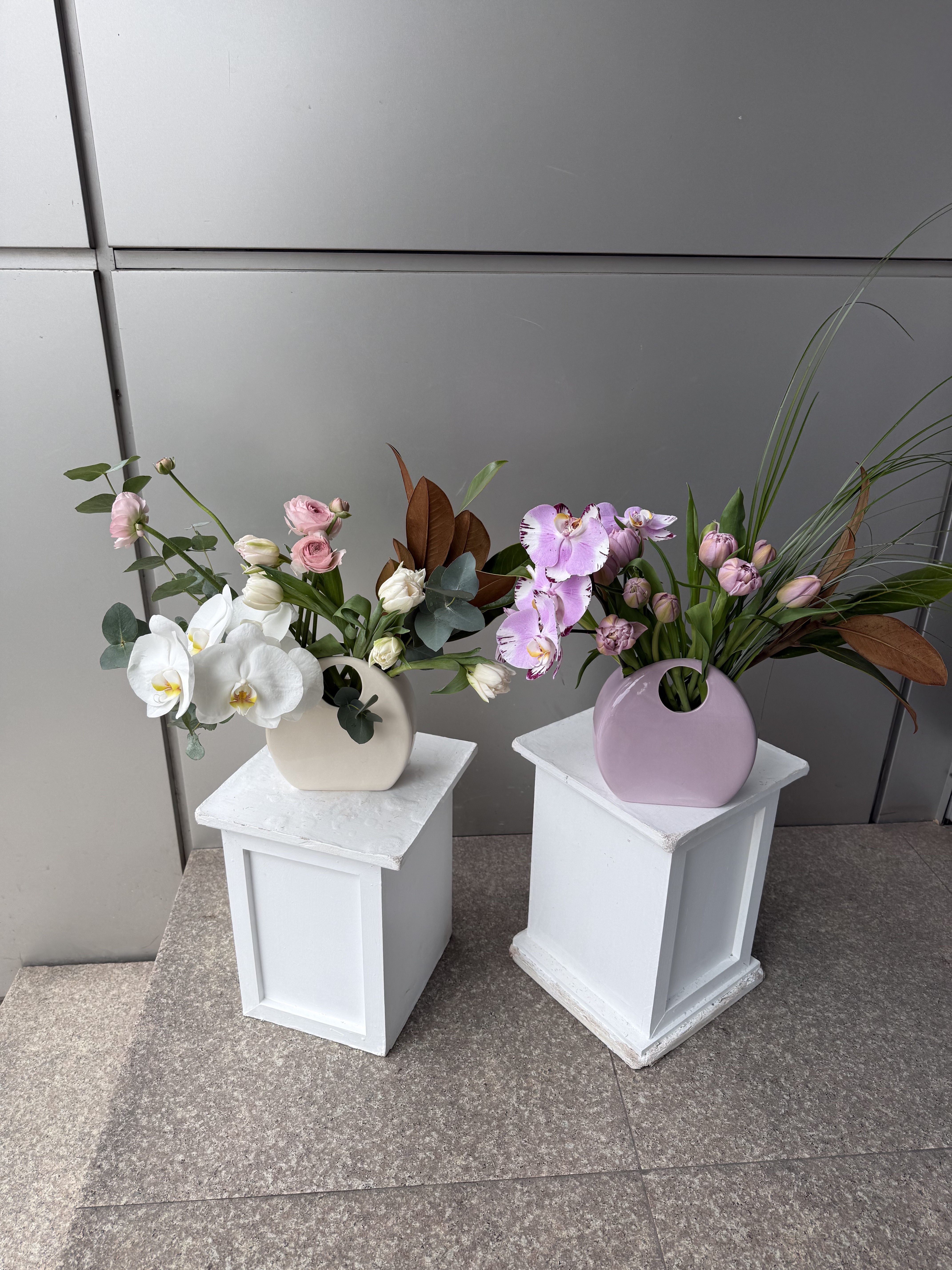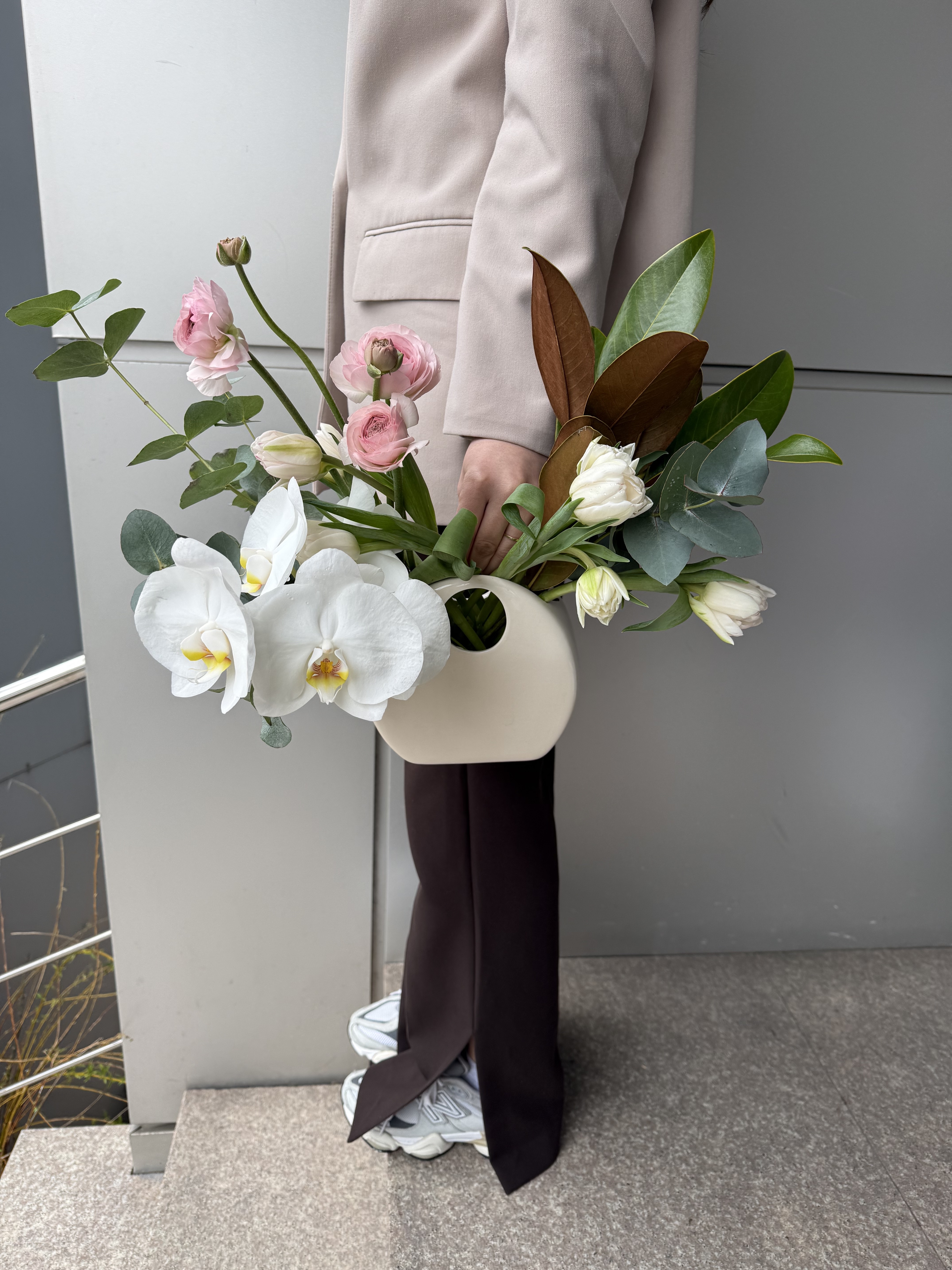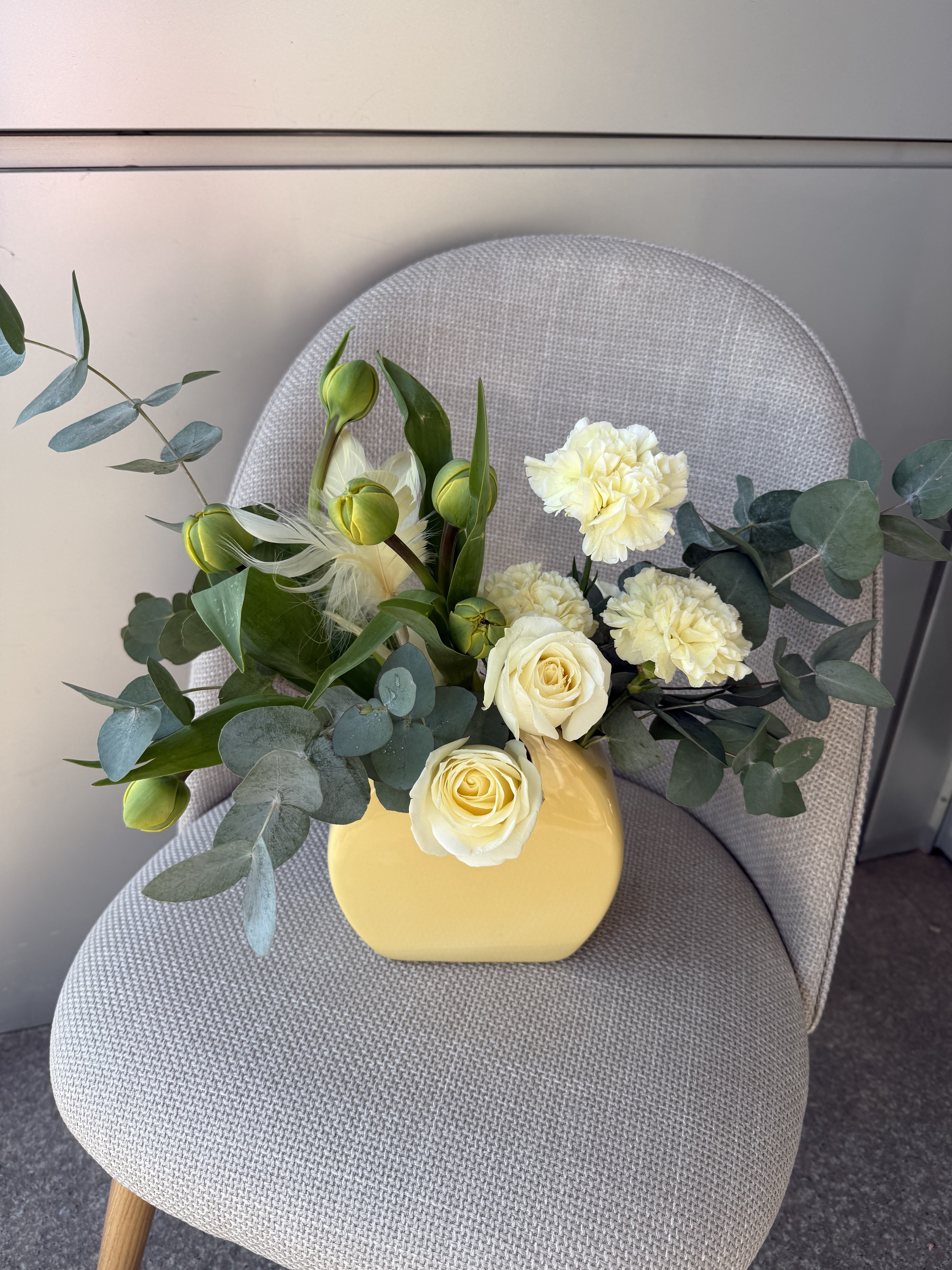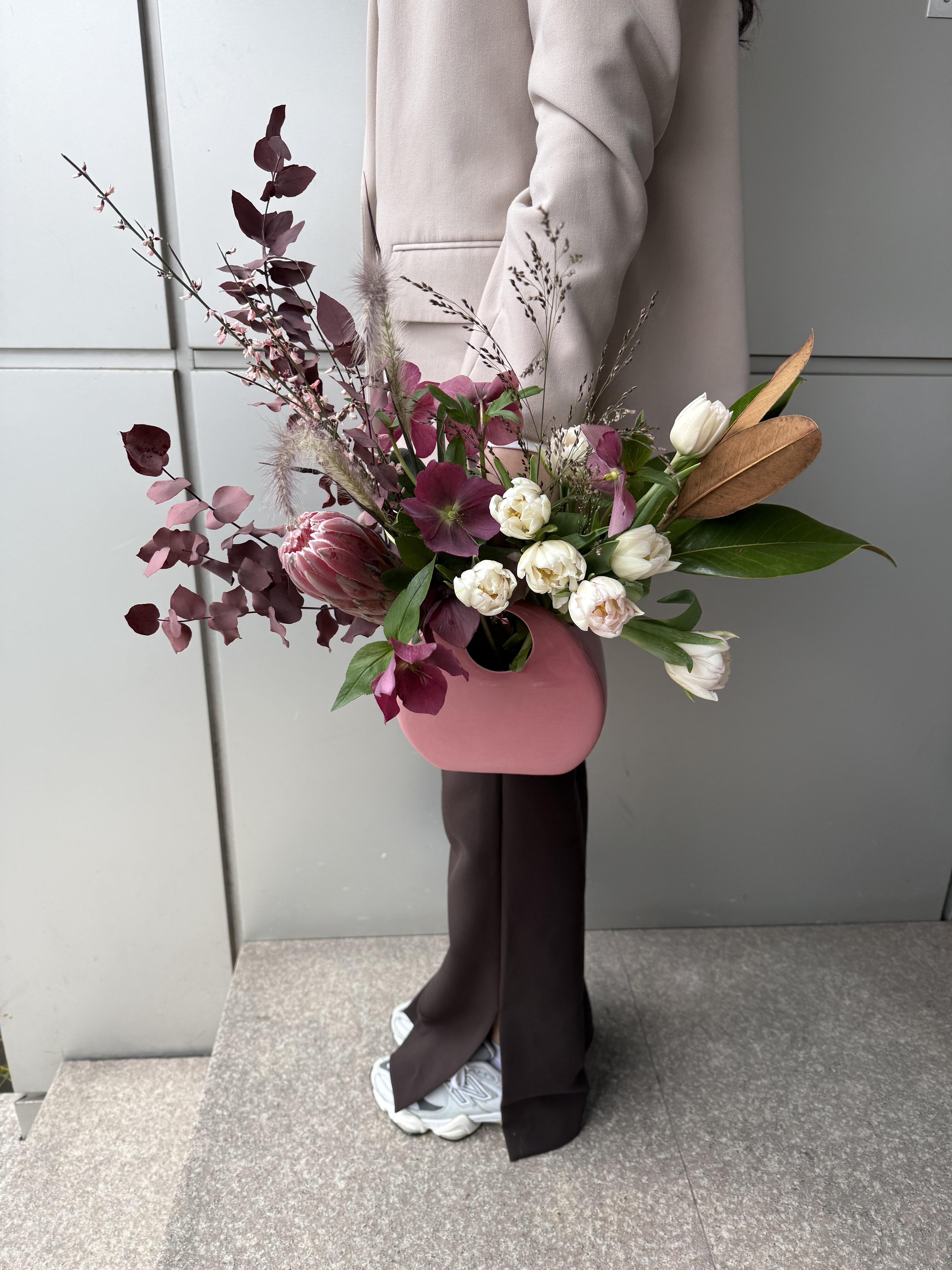 Compozitie florala la alegerea floristului, in functie de sezon, de florile proaspete disponibile in atelier.