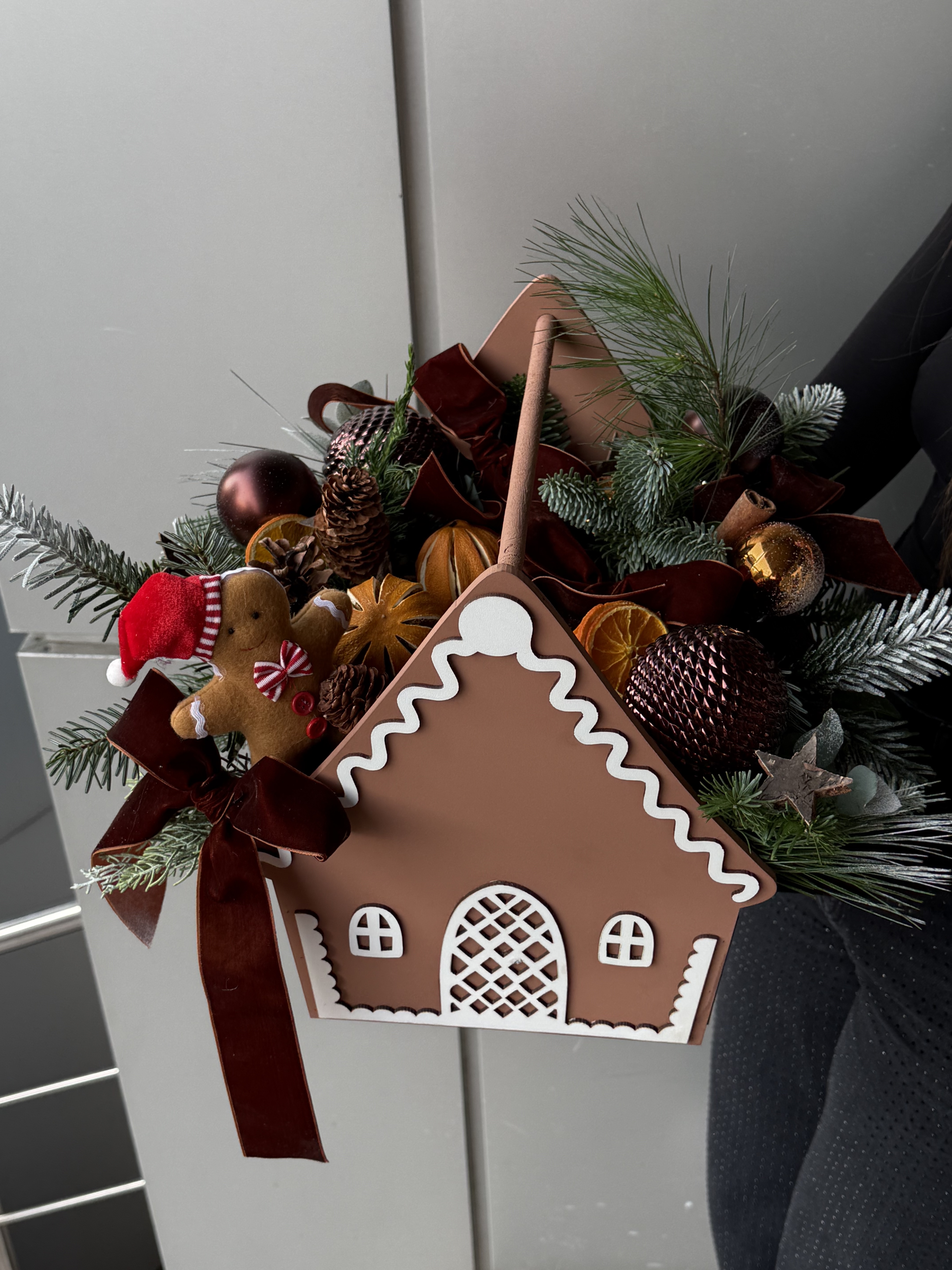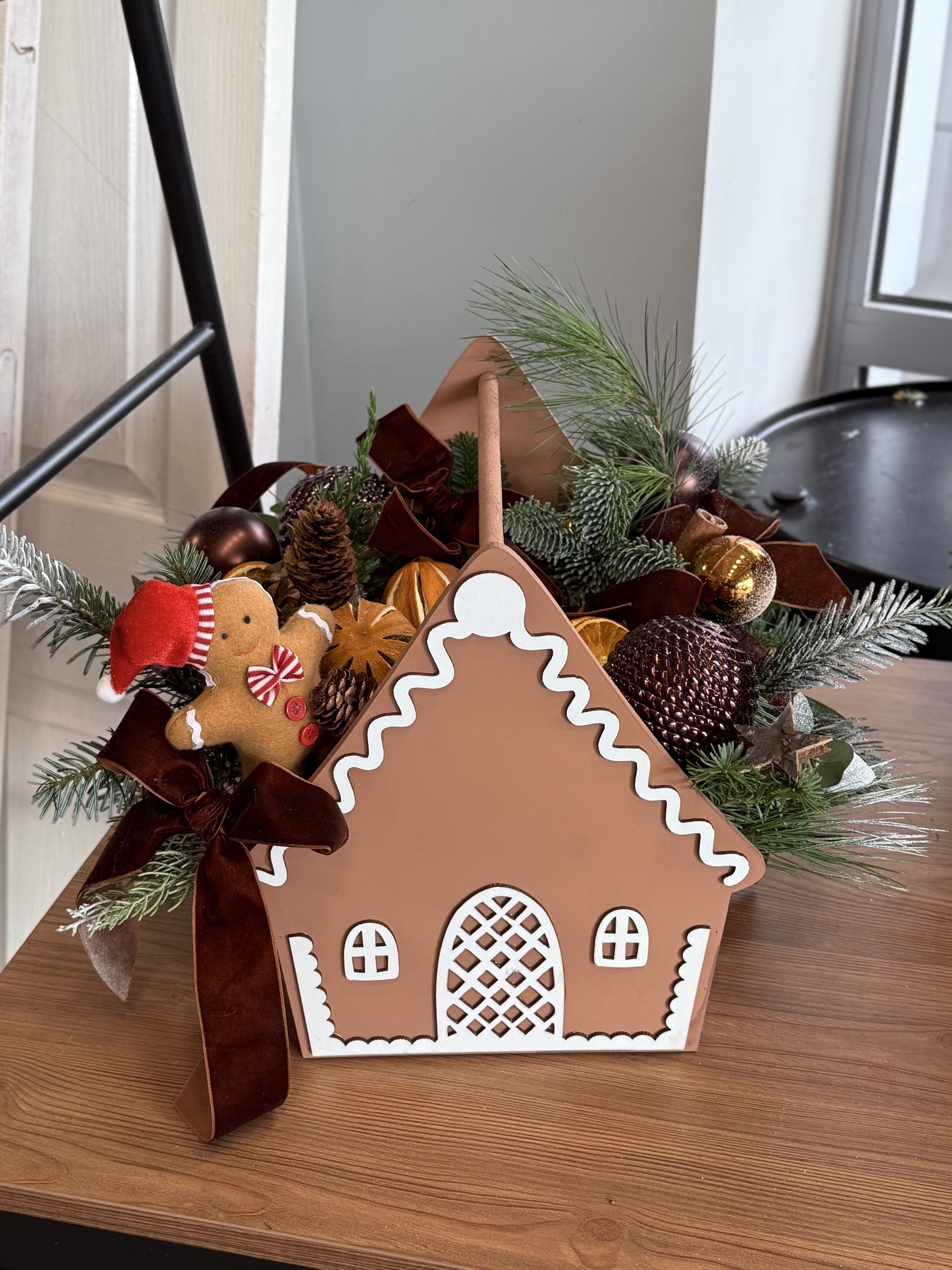 Aranjament floral realizat in cutie de lemn cu brad, accesorii, crengute de pin, conifere, portocale, decoratiuni de sarbatori, conuri, scortisoara.